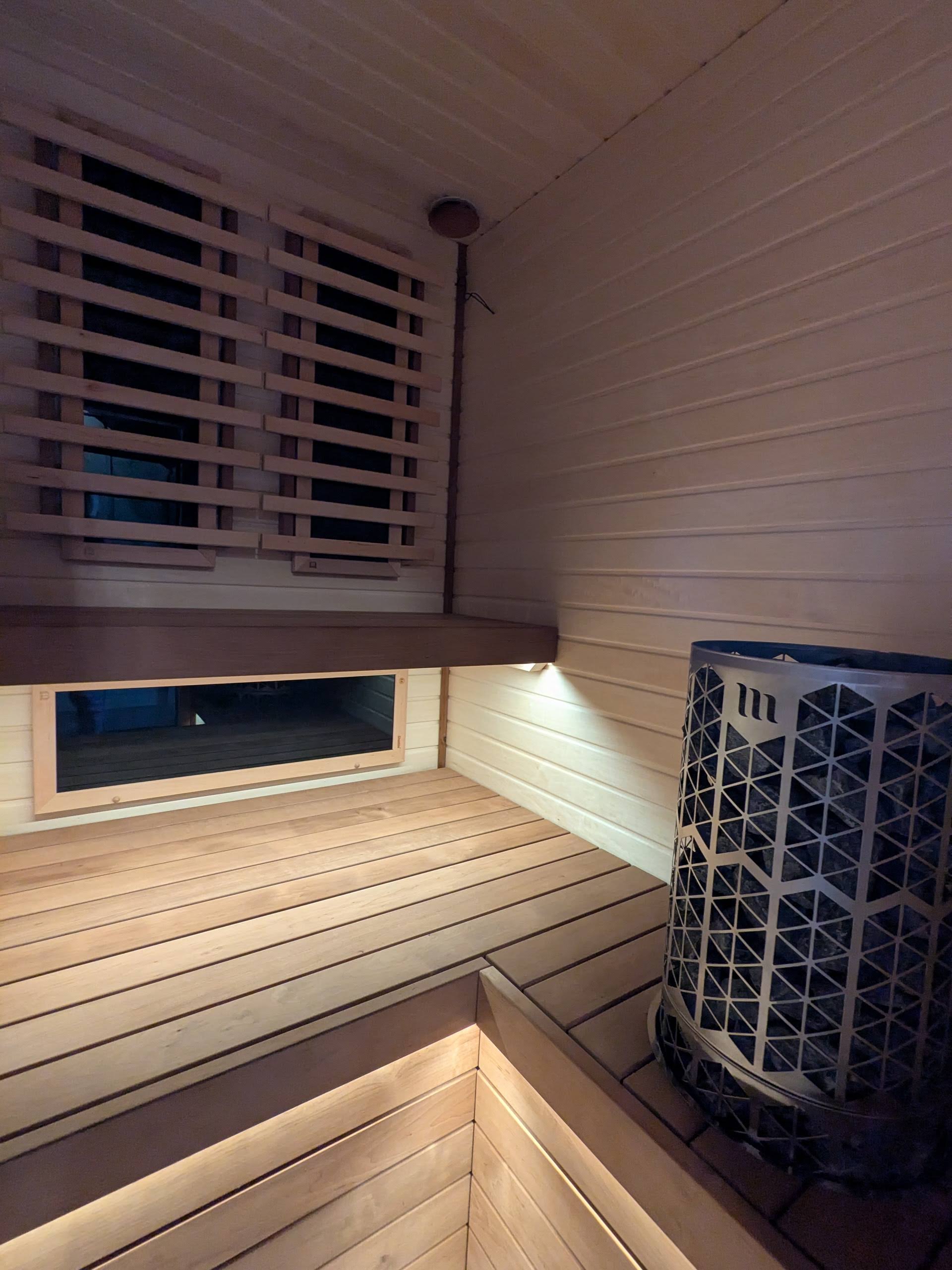 Istotnym elementem projektu jest światło. Taśmy LED ukryte pod ławą i pod górną półką dają równomierne, nierażące oświetlenie, które nie męczy wzroku podczas seansu. Dodatkowy punkt przy piecu podkreśla strukturę drewna na ścianie i poprawia komfort korzystania z sauny po zmroku. Dzięki temu, mimo niewielkiej kubatury, wnętrze nie sprawia wrażenia ciemnego ani „zamkniętego”.