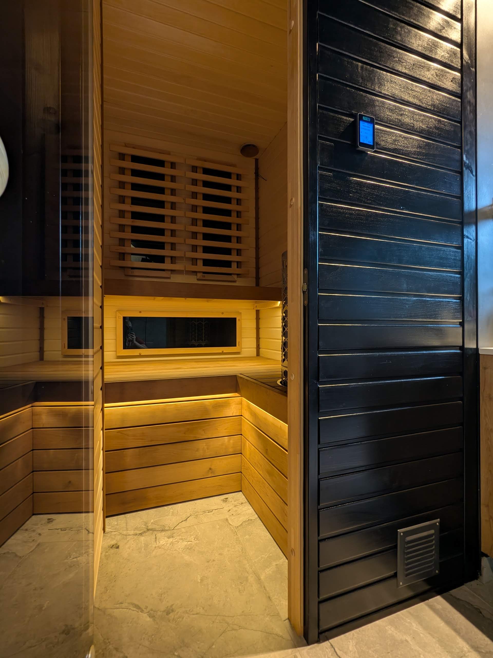W tej realizacji zaprojektowaliśmy kompaktową saunę fińską w istniejącej łazience, tak aby stworzyć prywatną strefę regeneracji bez ingerencji w układ całego domu. Wejście do sauny zostało dyskretnie wkomponowane w czarną, listwowaną zabudowę ściany – po zamknięciu drzwi całość tworzy jedną, spójną płaszczyznę. Sterownik pieca umieściliśmy na zewnątrz, w zasięgu ręki, ale poza strefą podwyższonej temperatury.