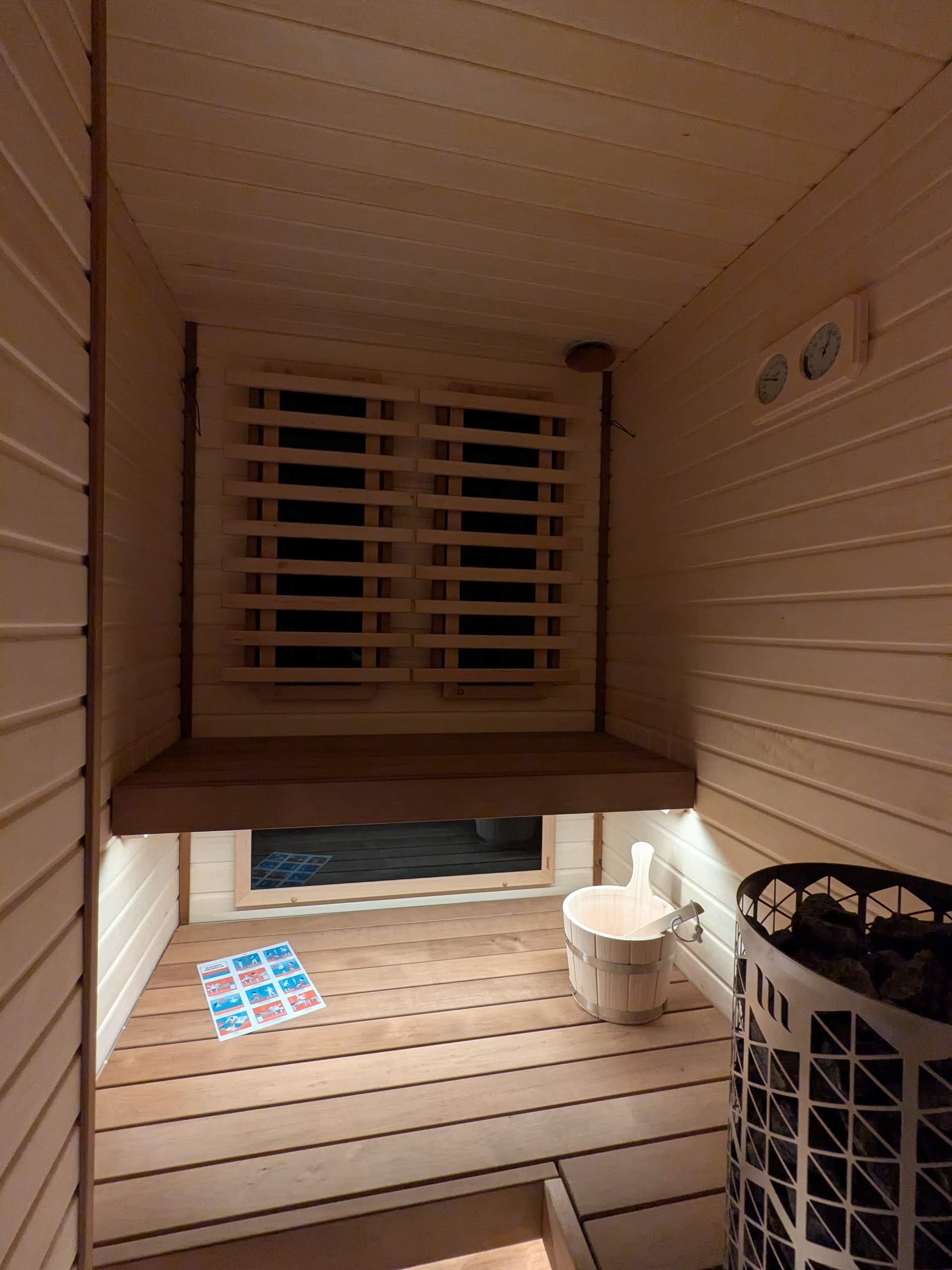 Całość uzupełniają detale użytkowe: klasyczne wiaderko z czerpakiem, analogowy termometr z higrometrem oraz łatwy w utrzymaniu w czystości kamienny gres na posadzce. Dzięki temu realizacja nie jest tylko „ładnym pudełkiem z drewnem”, ale funkcjonalnym, dobrze przemyślanym miejscem do regularnego korzystania z sauny w domowych warunkach.